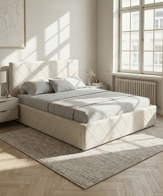 Eleganckie łóżko tapicerowane Alessio Bed Design ze stylowym zagłówkiem oraz możliwością wyboru pomiędzy wersją z pojemnikiem lub bez pojemnika na pościel.
