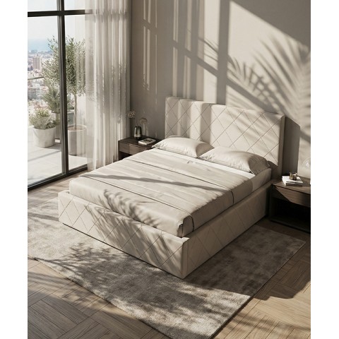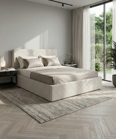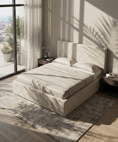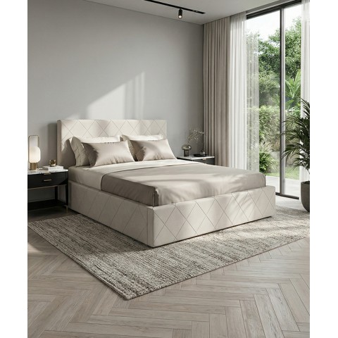Łóżko tapicerowane z głębokimi wciągami, bez nóżek. Występuje w wersji z pojemnikiem na pościel i bez.