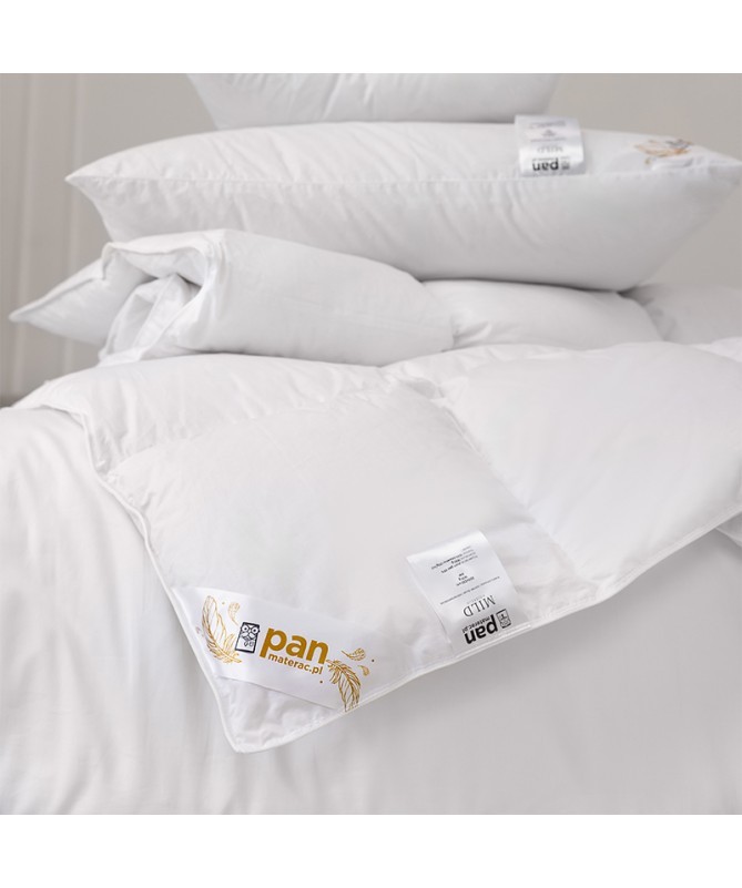Kołdra puchowa Mild marki Pan Materac, w wersji całorocznej. Wymiary: 200x220 cm.