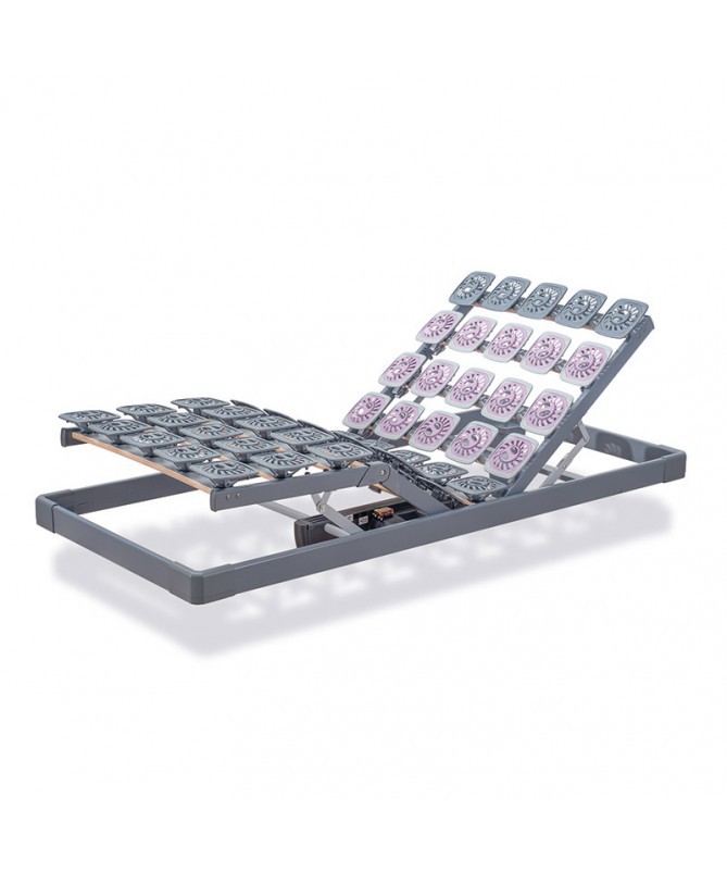 Stelaż został zaprojektowany z solidną, wzmocnioną ramą oraz sprężynowymi elementami o otwartej konstrukcji, co zapewnia większą trwałość i lepsze podparcie. Wyposażono go również w silnik, który pozwala na cichą i płynną regulację ustawienia. Kluczową nowością w tym modelu jest wyjątkowo miękka strefa w okolicy ramion - idealne rozwiązanie dla osób śpiących na boku. Powierzchnia nośna oparta jest na sprężynowych komponentach, które wzmacniają newralgiczne punkty i umożliwiają swobodny przepływ powietrza wewnątrz materaca. W komplecie znajduje się bezprzewodowy pilot do łatwego sterowania, a dodatkowo istnieje możliwość obsługi stelaża za pomocą smartfona lub tabletu.