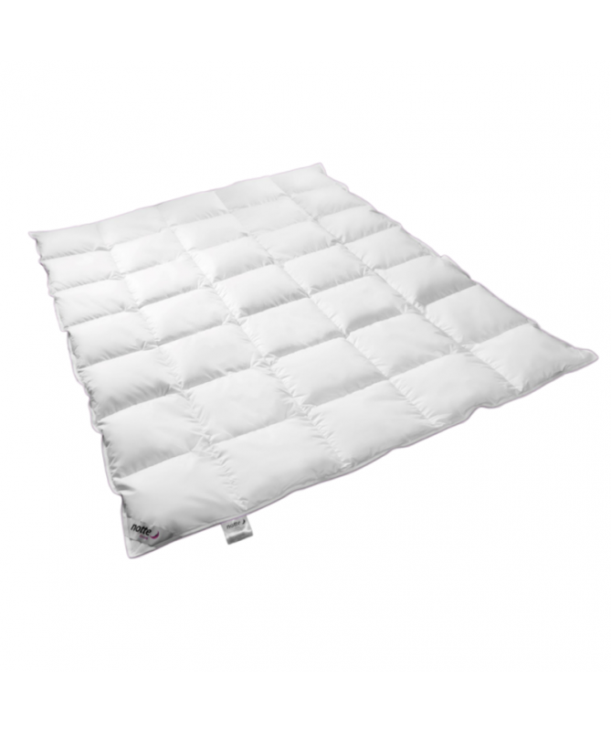 Notte Amore to całoroczna kołdra wypełniona w 90% pranym puchem gęsim najwyższej jakości, zapewniającym komfort termiczny przez cały rok. Polski, ręcznie wykonany produkt z kasetonową konstrukcją zapobiegającą przemieszczaniu się wypełnienia. Poszycie z batystu bawełnianego z fioletową bizą i haftowanym logotypem jest puchoszczelne. Materiały spełniają normę PN-EN 12934, Klasa I, a puch ma sprężystość 700 cu.in. Kołdrę należy wietrzyć, strzepywać i czyścić zgodnie z zaleceniami producenta.