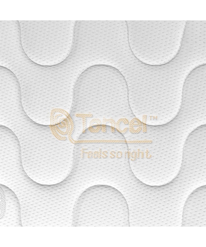 Pokrowiec Tencel wykonany jest z ekologicznej dzianiny powstałej z biodegradowalnych włókien. Wyróżnia się doskonałą przewiewnością oraz zdolnością do wchłaniania wilgoci, co pomaga utrzymać odpowiednią temperaturę podczas snu i ogranicza rozwój bakterii, zapewniając komfortowe warunki w sypialni. Proces jego produkcji posiada certyfikację i odbywa się bez użycia szkodliwych substancji. Dzięki pikowaniu materiał jest wyjątkowo miękki i przyjemny w dotyku. Pokrowiec można prać w temperaturze do 40°C. Wersja pikowana.
