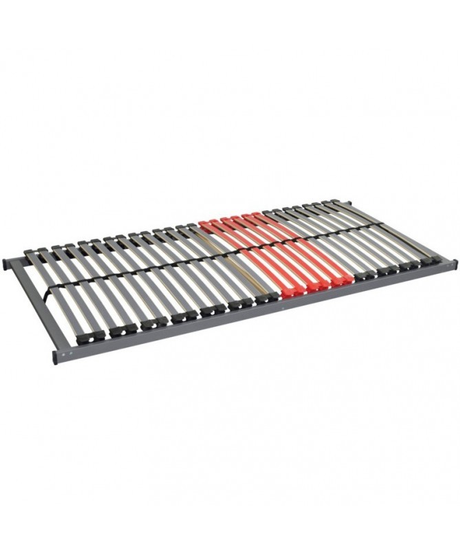 Model FLEX R6 to klasyczny stelaż bez regulacji, wyposażony w gęsto rozmieszczone, elastyczne listwy wspierające materac i zapewniające jego wentylację od spodu. Na całej długości znajduje się 28 listew, a niewielkie odstępy między nimi pozwalają stosować go z materacami piankowymi, lateksowymi i kieszeniowymi. W części lędźwiowej zastosowano podwójną listwę zwiększającą twardość podparcia. Listwy i boki pokryto folią Carbon, która chroni pokrowiec przed uszkodzeniami oraz zabezpiecza drewno przed wilgocią. Osadzono je w bukowej ramie z użyciem podwójnych uchwytów gumowych, co poprawia ich elastyczność. Konstrukcję wzmacnia pas środkowy, równomiernie rozkładający ciężar i zapobiegający odkształceniom. W najbardziej obciążonych miejscach znajdują się listwy R6 o podwójnej grubości, a w górnej części zastosowano strefy o różnej twardości podparcia, które zapewniają komfort w każdej pozycji. Stelaż Materasso Flex R6 ma wysokość 8 cm i nośność do 120 kg.