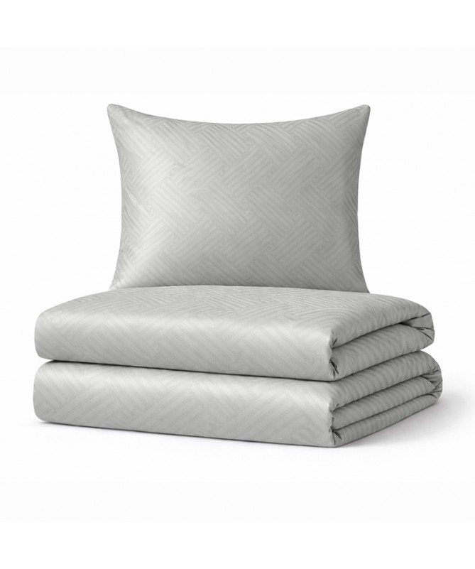 Elegancka pościel z bawełny o subtelnym, geometrycznym wzorze adamaszkowym, zapewniająca komfort snu i ponadczasowy wygląd sypialni.
