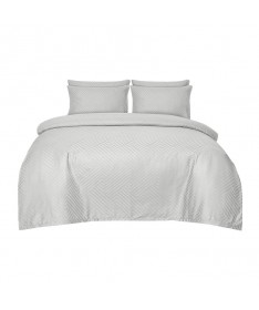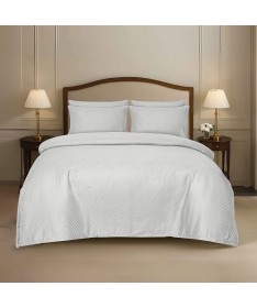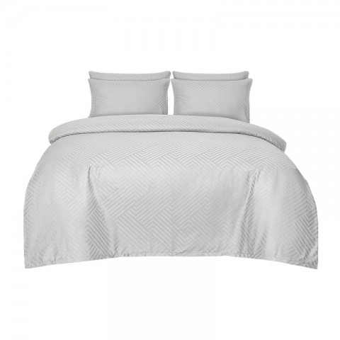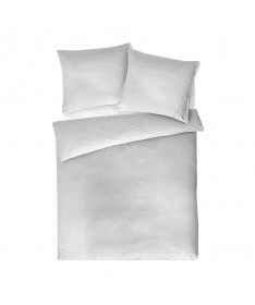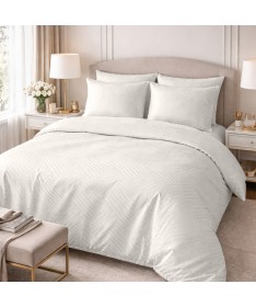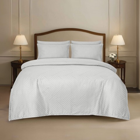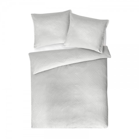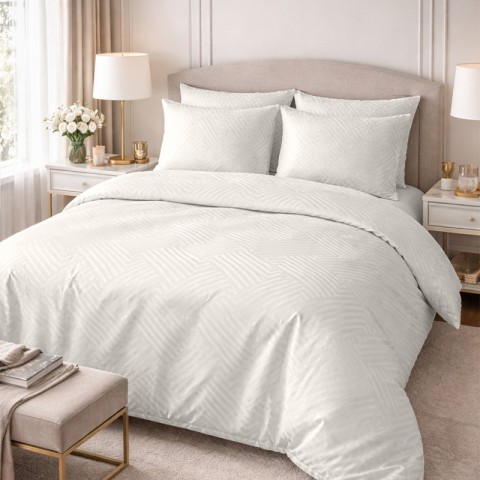 Elegancka biała pościel z delikatnej bawełnianej tkaniny adamaszkowej o lekkim połysku, ozdobiona efektownym wzorem geometrycznym.