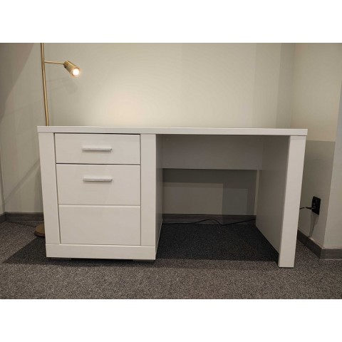 Białe biurko z szufladą i szafką Snow z kolekcji Forte Meble. Wymiary: 138x75,9x67,4 cm.